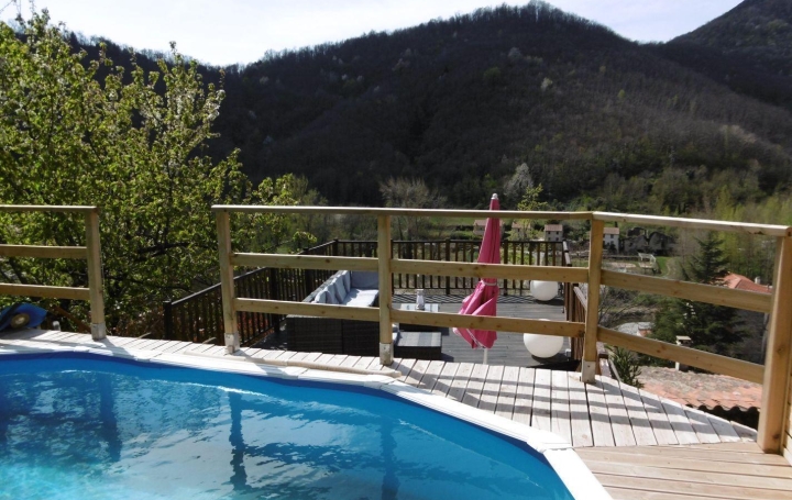 Maison de village en pierre - idéalement orientée et avec des prestations de qualité : sols parquet - double vitrage - cheminée insert. La maison s'établit sur 3 étages avec 3 chambres - une grande cuisine - un salon de 30m2 - lumineux et avec cheminée à insert - ainsi que deux pièces supplémentaires qui peuvent devenir - selon vos besoins - salle de jeux - bureau - salle de lecture. Au dernier étage se trouve un grenier. A l'arrière de la maison et au dernier niveau - vous avez une cuisine d'été spacieuse - une terrasse pour installer un grand salon de jardin et une piscine hors-sol. Le tout offrant une magnifique vue sur les hauteurs du village et sur la montagne. Cette maison se compose de 4 étages - le jardin se trouve au dernier niveau et à l'arrière de la maison - son accès ne conviendra donc pas à des personnes à mobilité réduite. - Mentions légales : Proposé à la vente à 159000 Euros (honoraires à la charge du vendeur) - Classe Energie C : 150 kWh.m2.an - (DPE ancienne version)